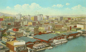 Portland Harbor in the 1890s: This hand-tinted postcard image of the Portland waterfront just after the turn of the century does not appear on the front cover, but is a good overview of the more "respectable" end of the waterfront. Notice the wharves and warehouses have false fronts on them, facing Front Street.
